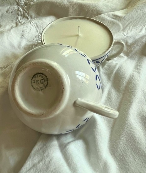 Bougies artisanale coulée dans une tasse ancienne de la manufacture HBCM (France). Parfaitement imparfaite, elle porte les traces du temps.
