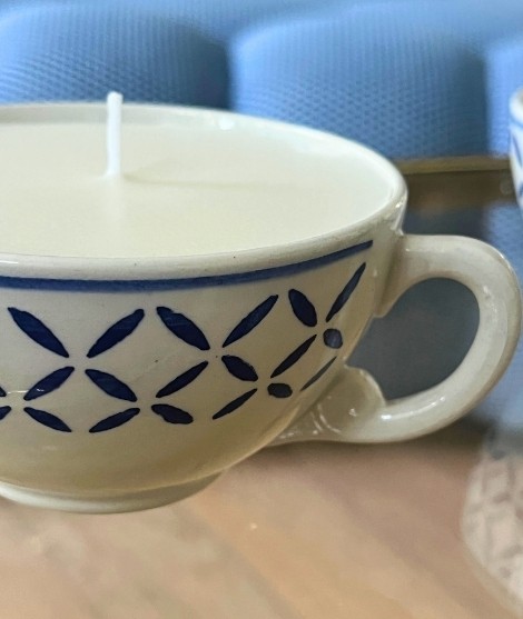 Deux jolies bougies artisanales coulées dans des tasses à café en faïence française, chinées.